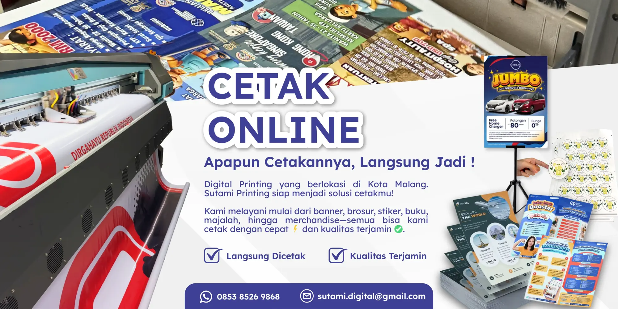 Cetak kebutuhan digital outdoor untuk media promosi seperti banner, X-banner, poster: A2, A1, A0.